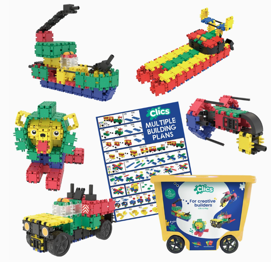 Rinkinyje yra 463 Clics detalės, 97 aksesuarai, lipdukai ir 20 statymo planų. Su jais galėsite pasistatyti lenktyninį automobilį, sunkvežimį, autobusą ar net vandens motociklą. Mėgstantys nuotykius atras krokodilą, dinozaurą ar liūtą, pasislėpusius už kampo.