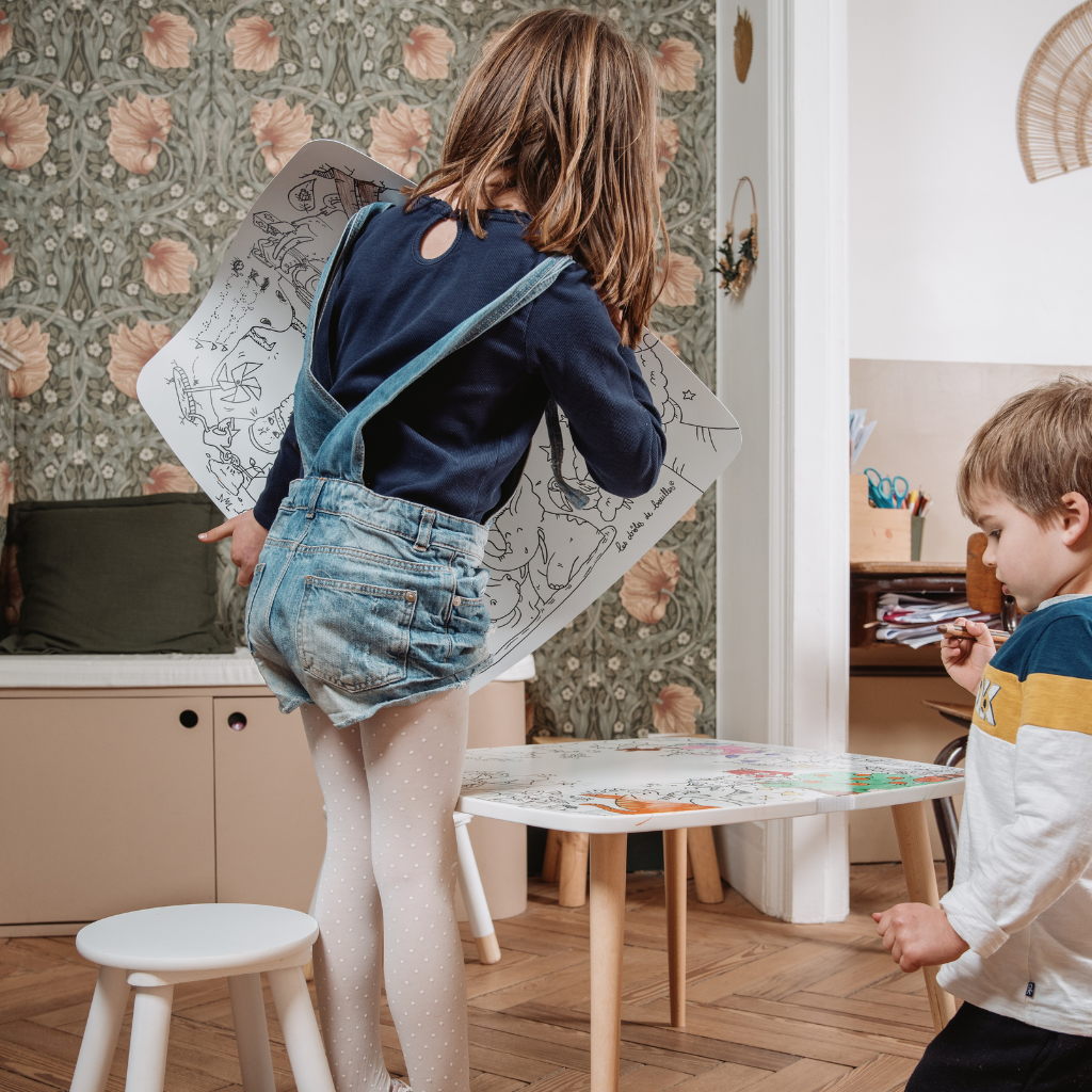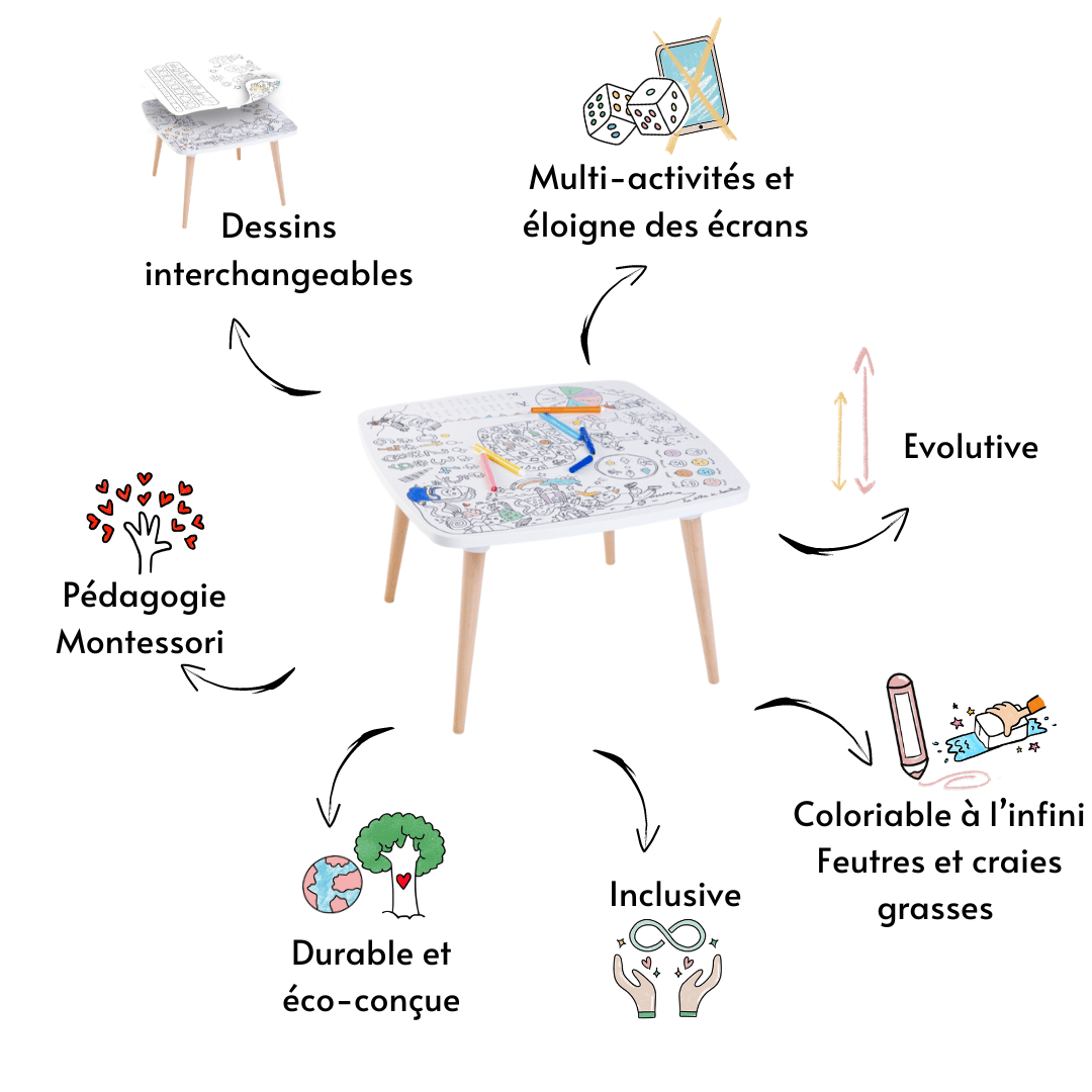 Šis stalas yra patvarus ir pagamintas iš kokybiškų medžiagų. Jis prisitaiko prie vaikų ūgio dėl turimų kojų prailginimų (juos rasite čia, į pakuotę neįeina). Lentelė yra keičiamo dydžio. Vaikai gali keisti piešinius dėl turimų papildymų. Dizainai tinka bet kokio amžiaus žmonėms, nes yra sudaryti iš mažų ir didelių formų. Šis linksmas ir žaismingas stalas padeda lavinti vaikų kūrybiškumą. Įkvėptas Montessori pedagogikos, pagrįstas edukaciniu požiūriu, kai mokomasi eksperimentuojant ir autonomiškai.