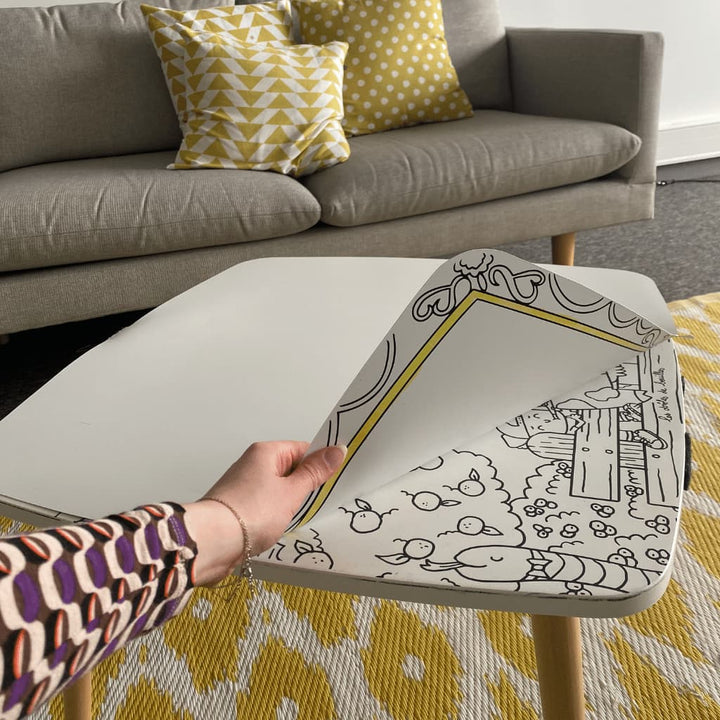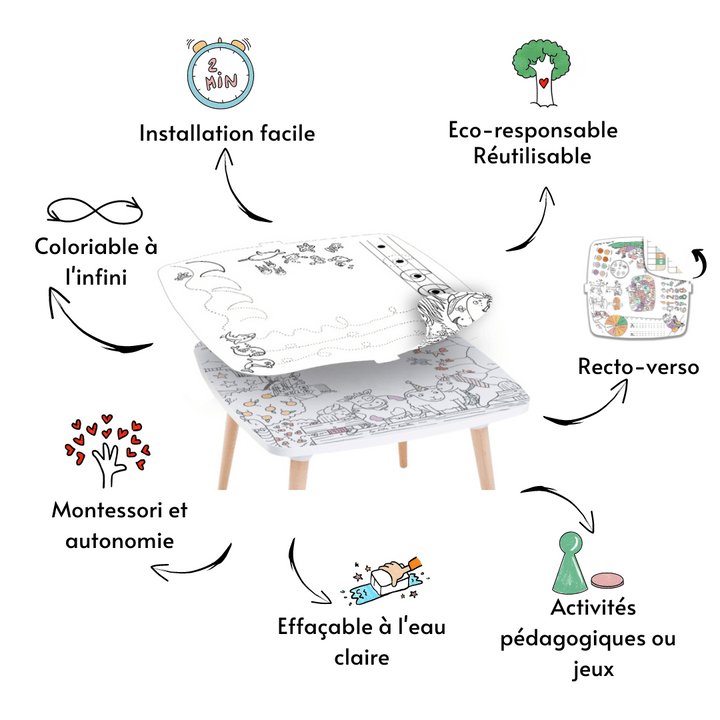 Pakartotinai užlipdę papildymą galėsite akimirksniu pakeisti spalvinimo stalo dizainą. Jį galima labai lengvai pritvirtinti prie stalo paviršiaus naudojant Velcro sistemą.