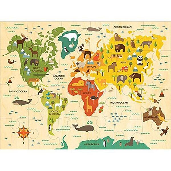 Atrask pasaulį kartu su šia smagia ir lavinančia grindų dėlione! Iš 24 didelių detalių sudėliojus gaunamas 45 × 60 cm dydžio paveikslas su stilingu pasaulio žemėlapiu. Tai puikus būdas supažindinti vaikus su žemynais, šalimis ir jų įvairove.