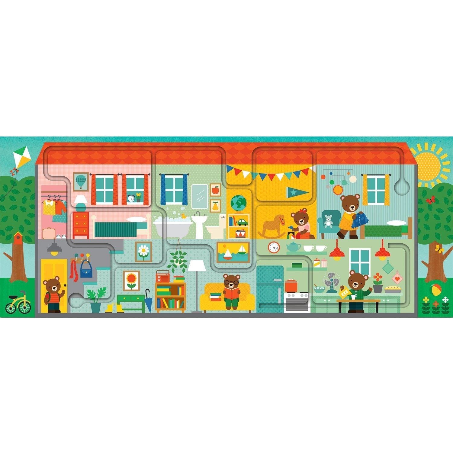 Paveiksle yra reljefinis takelis, kuriuo mažasis lokys turi pereiti visą namą iki lovytės. Vaikas gali pirštuku sekti labirinto takelius, keliauti per spalvingą lokio namą ir pažinti įvairius jame esančius daiktus.