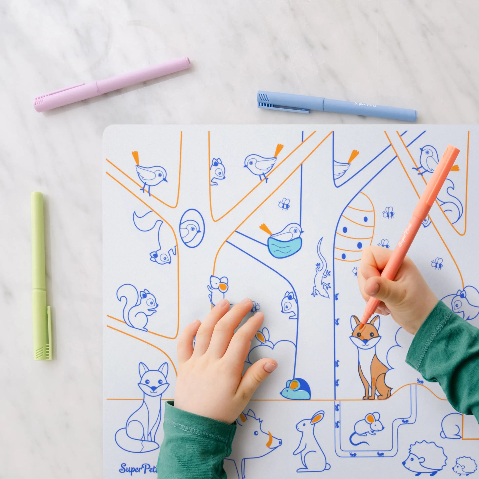 Skaičiuok ir spalvink gyvūnus, mokykis vesti skaičius ir įsimink juos žaismingai. Daugkartinis, nuvalomas silikoninis kilimėlis su 3 žymekliais.