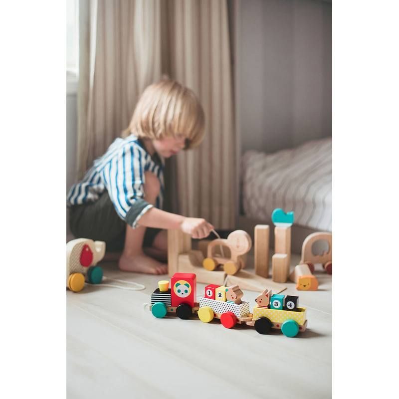 Nuostabus daugiafunkcis medinis žaislas -traukinukas! Rinkinį sudaro keturi blokeliai: kroviniai su skaičiais ir du gyvūnėliai - keleiviai. Vagonai gali būti atjungiami vienas nuo kito, todėl kiekvienas iš jų tampa atskira transporto priemone. Tačiau visi kartu jie sudaro vieną draugišką traukinuką, kurį mažylis galės tempti su savimi, taip skatindamas ilgesnius pasivaikščiojimus ar net žengti pirmuosius žingsnius.