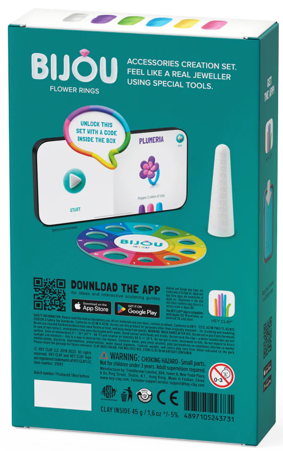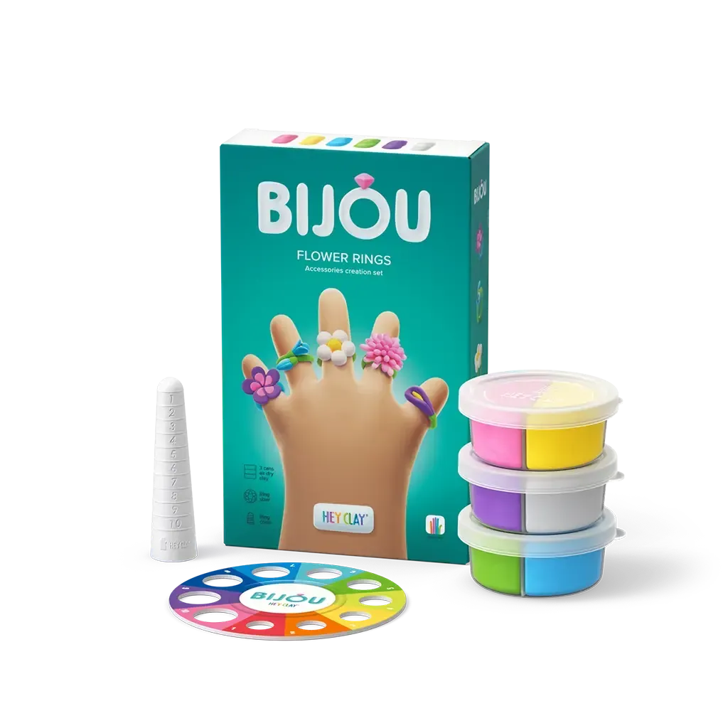HEY CLAY modelino rinkinys „Rings Flower“ - kūrybinis rinkinys vaikams, leidžiantis susikurti savo gėlių žiedus iš lengvo, oru džiūstančio modelino. Dėžutėje yra skirtingų spalvų modelino masė, supakuota į 3 uždaromus indelius. Norint nulipdyti siūlomus personažus ir žiedus, tereikia parsisiųsti nemokamą HEY CLAY programėlę, įvesti dėžutėje esantį kodą, sekti žingsnis po žingsnio instrukcijas ir nulipdyti figūrėlę. Galima lipdyti ir visiškai laisvai - naudojantis savo fantazija, be jokios pagalbos.
