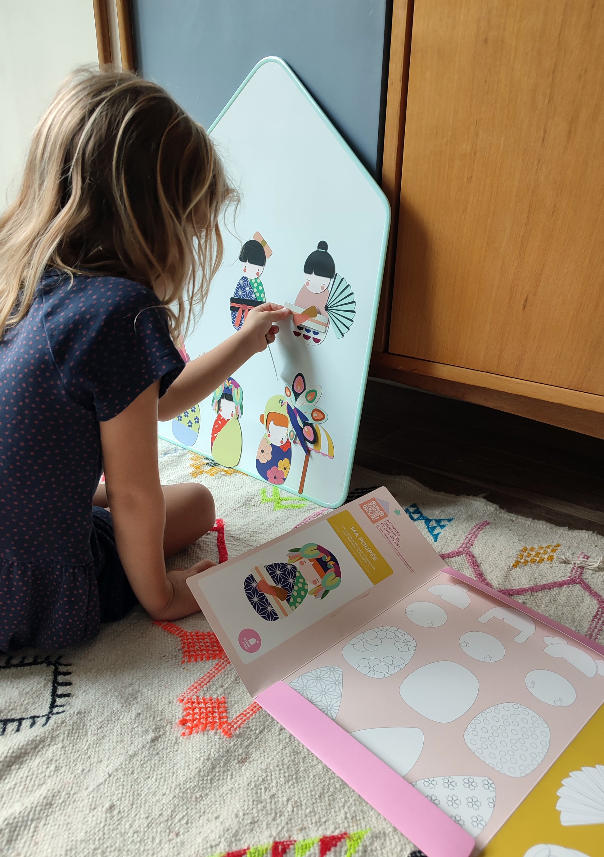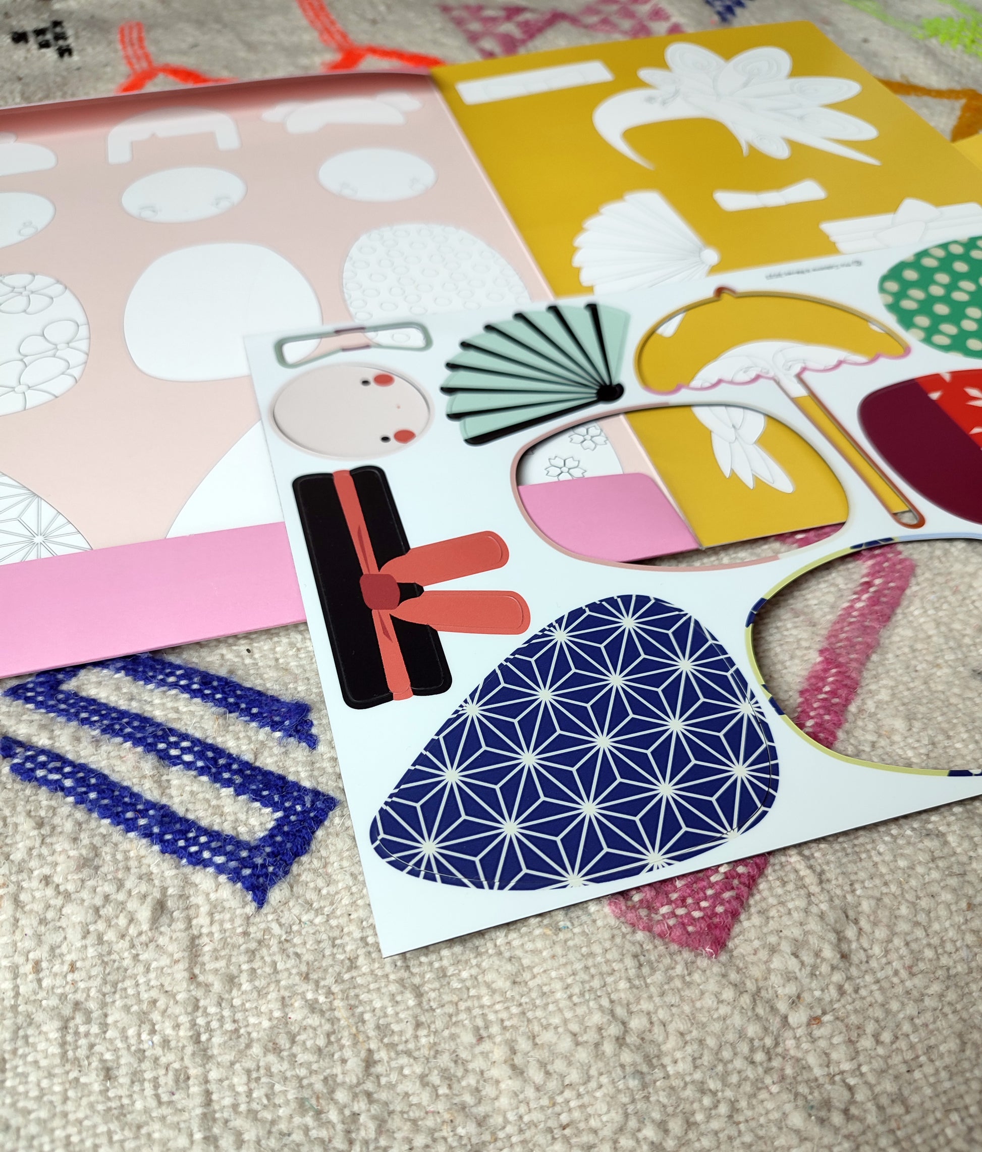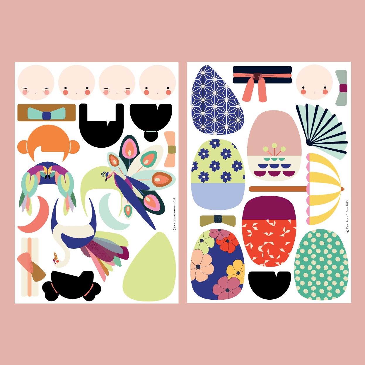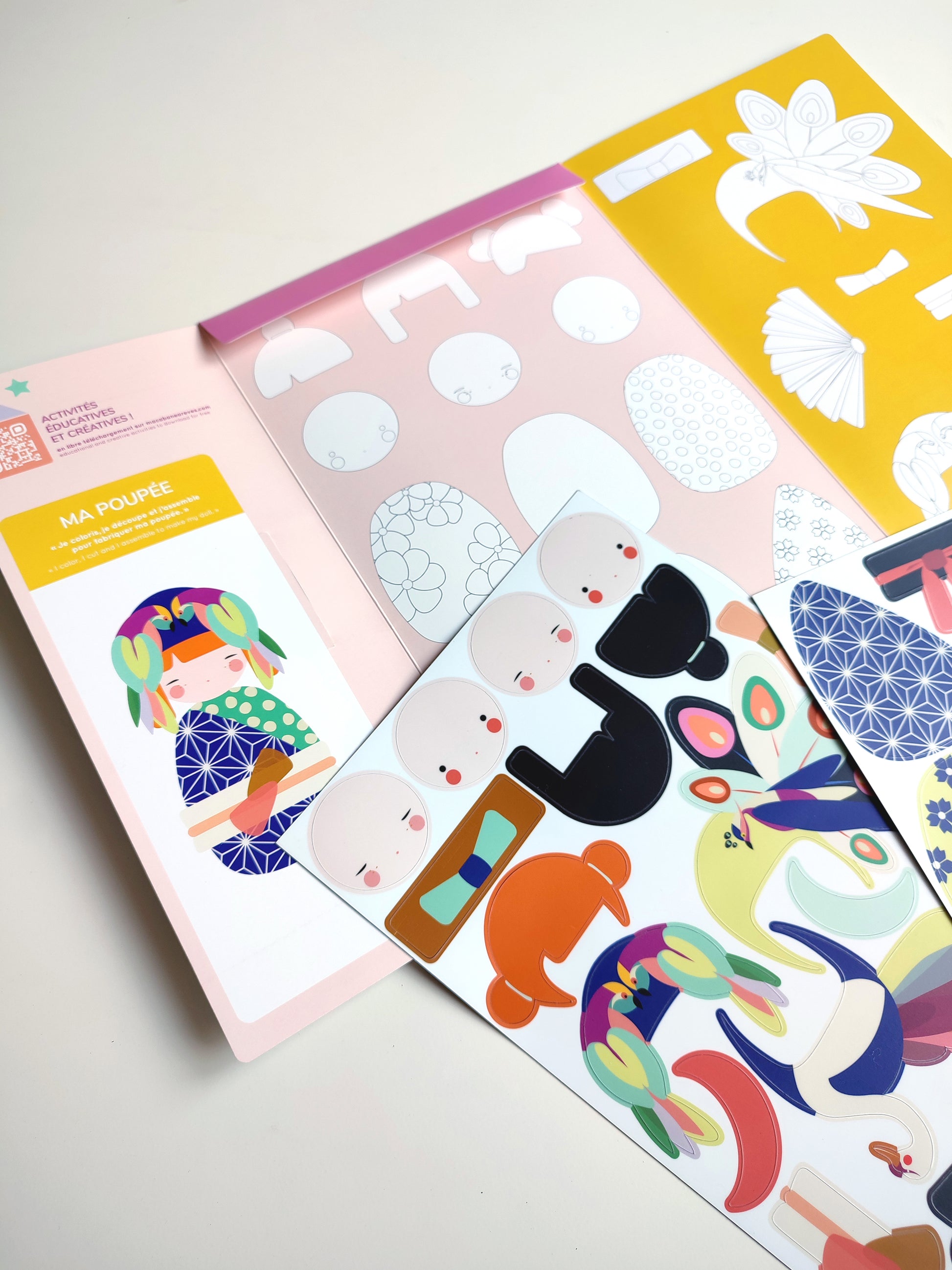 3 lėlės, kurias galima nuspalvinti, iškirpti ir surinkti pakuotės gale.