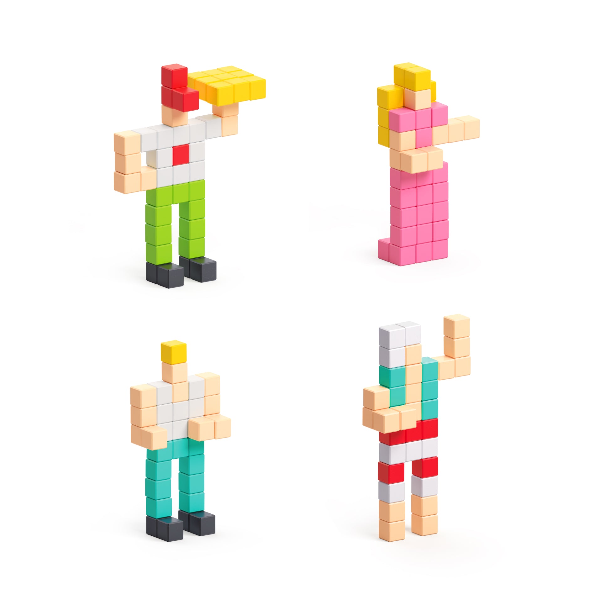Kiekvienas PIXIO blokelis yra mažas plastikinis kubelis, kurio matmenys yra 8 x 8 x 8 mm, sveria mažiau nei 1 gramą, viduje yra 6 magnetai. Magnetų padėtis ir poliškumas buvo suprojektuoti taip, kad blokai gali būti sujungti vienas su kitu bet kokia seka ir iš skirtingų pusių.