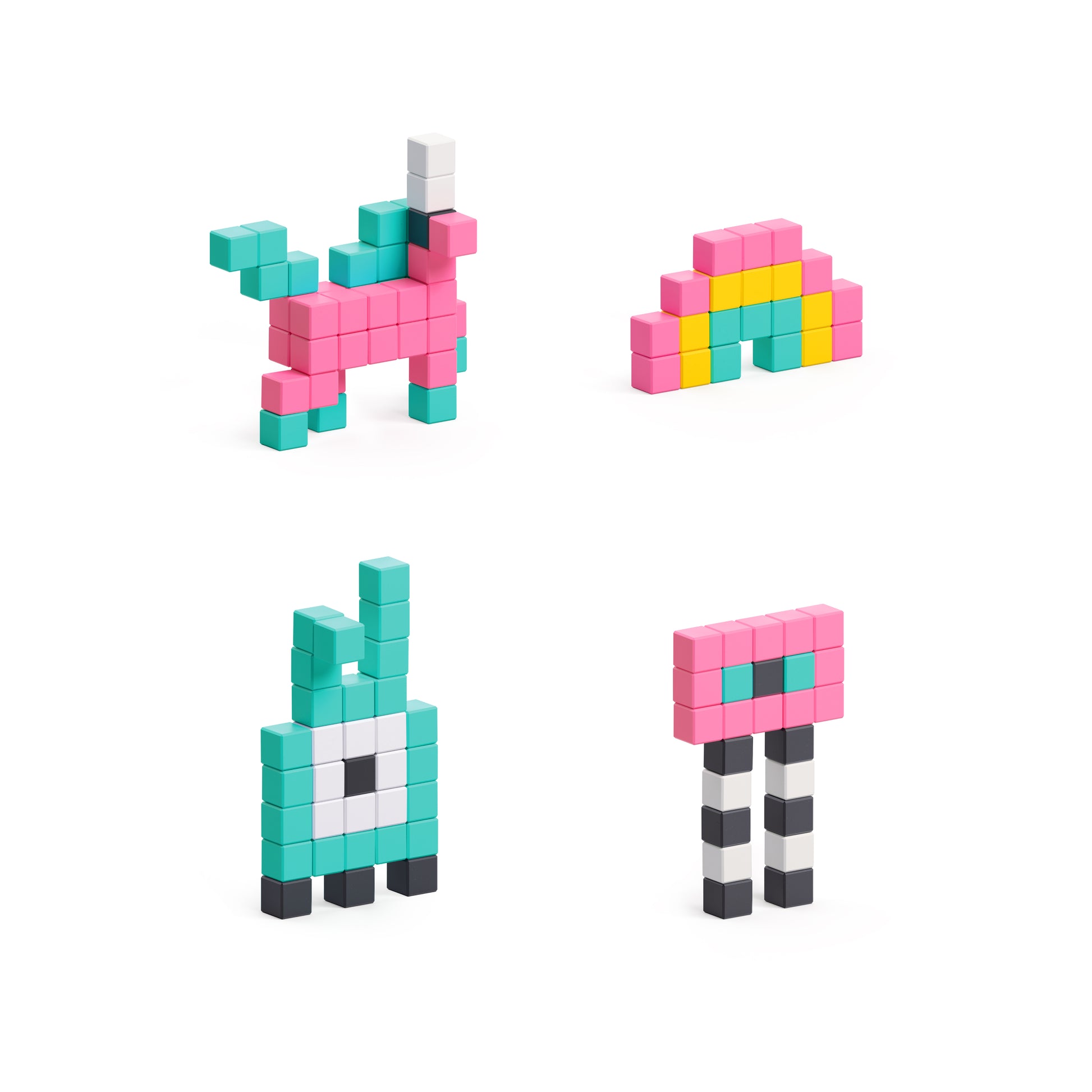 PIXIO-200 rinkinys suteikia jums du šimtus PIXIO blokelių aštuoniomis puikiai suporuotomis spalvomis. Tai šešios pagrindinės spalvos: juoda, balta, raudona, žalia, geltona ir turkio spalva, taip pat dvi naujos spalvos. Rožinė, viena iš populiariausių PIXIO® spalvų, yra labai svarbi kuriant princeses, vienaragius ir stebuklingas vaivorykštes.